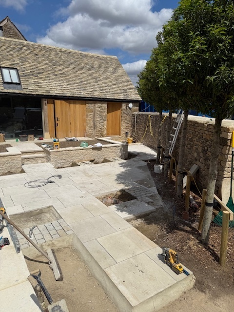 The project demonstrates our expertise in combining complex building renovations with high-end landscaping, delivering both functional improvements and elegant outdoor spaces that complement the character of a prestigious Cotswolds property.