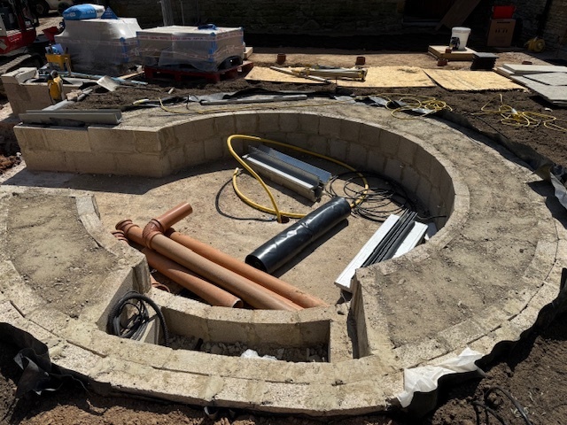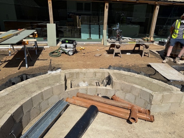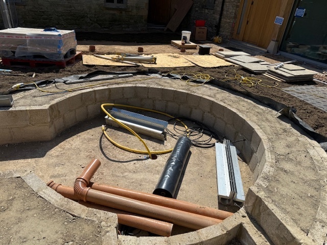 Walled Garden Courtyard:Excavation and landscaping of the courtyard, including the construction of a bespoke fire pit and installation of ducting for external electric lighting.